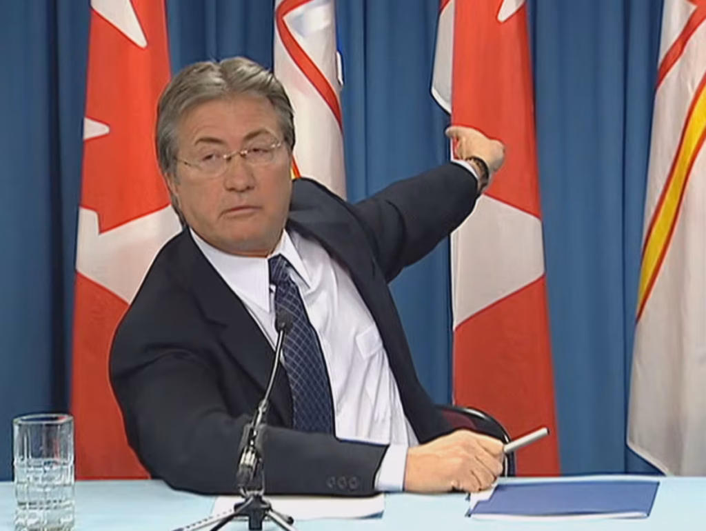Danny Williams, Premier of Newfoundland and Labrador, gestures toward the Canadian flag at the height of tense negotiations with the federal government in the early 2000s.